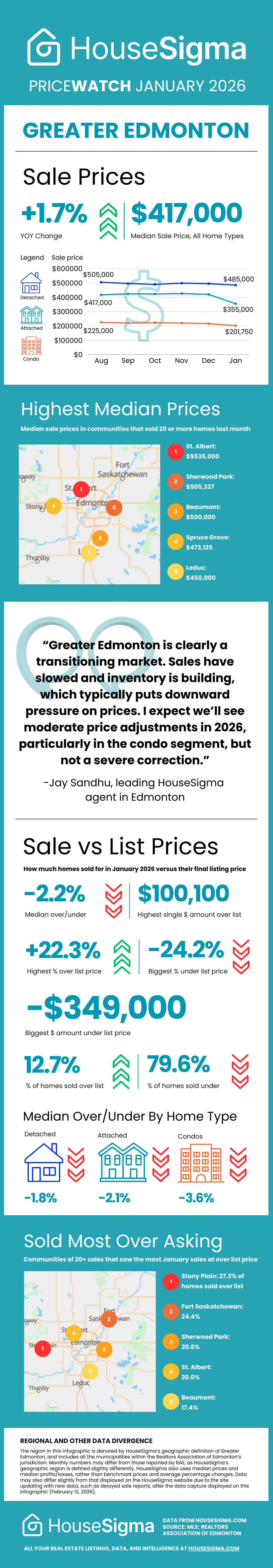 Check out the January 2026 Greater Edmonton PriceWatch infographic below for more real estate market data, including breakdowns by property type and municipality.