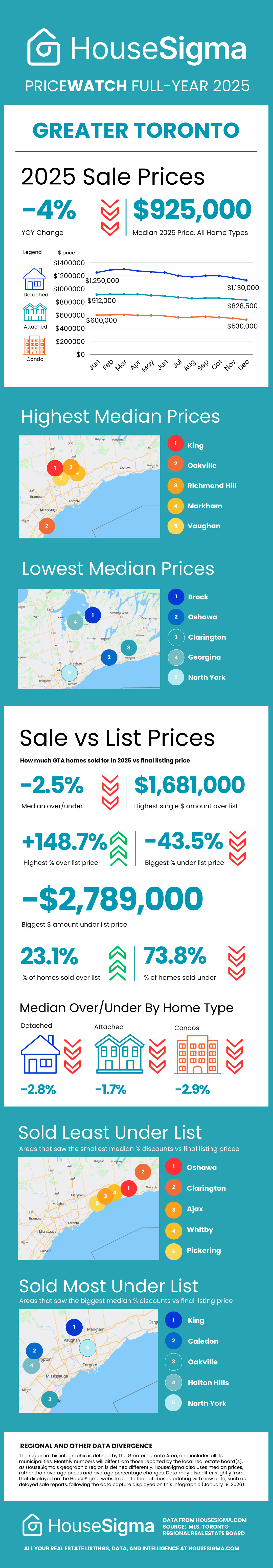 Check out the full-year 2025 GTA PriceWatch infographic, below, to see more details and breakdowns of median sale prices and discounts by property types and municipality rankings.