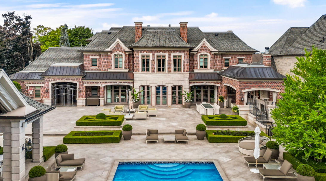 72 Manitou Drive, King: This is a huge French chateau-style home that seems built for royalty, with 22,000 square feet of living space, located in the Narrows of Kingscross Estates. The home is wall-to-wall marble and ultra-luxury finishes throughout. The grounds feature a circular parking courtyard and driveway for up to 20 cars, plus there’s an underground garage for an additional 10 cars. There is also a tennis court, and separate 3,400sf building housing a heated saltwater indoor pool with mural ceilings.